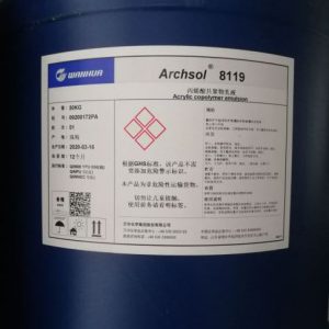 Các thông số cơ bản nhũ tương styrene acrylic Archsol 8119 Màu sắc: Trắng sữa Độ nhớt: 3000 – 8000 Hàm lượng rắn: 48% MFFT: 20 TG: 28 PH: 7-9 ứng dụng. sản xuất sơn, keo gián